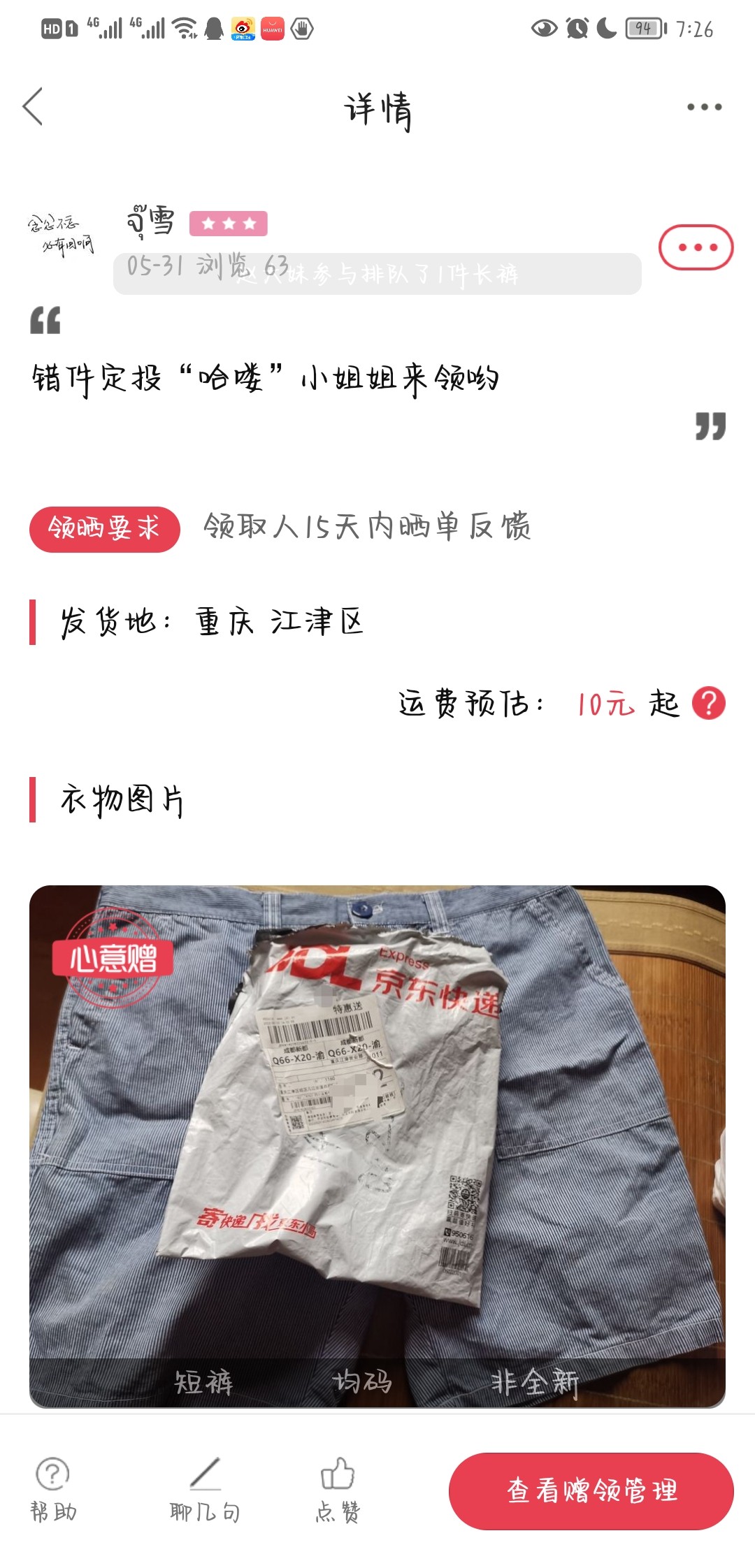 [已处理(发帖勿选)] 错件,退运费吧,我又被禁言又禁领的, |