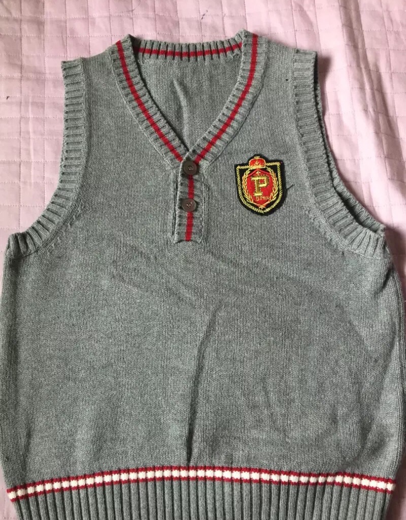 12,儿童毛背心,身高1米到130的穿吧,用来当校服的,穿了几次校服就下来了,所以这个假校服闲置了。